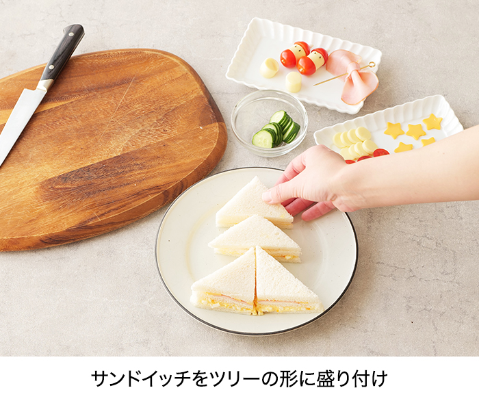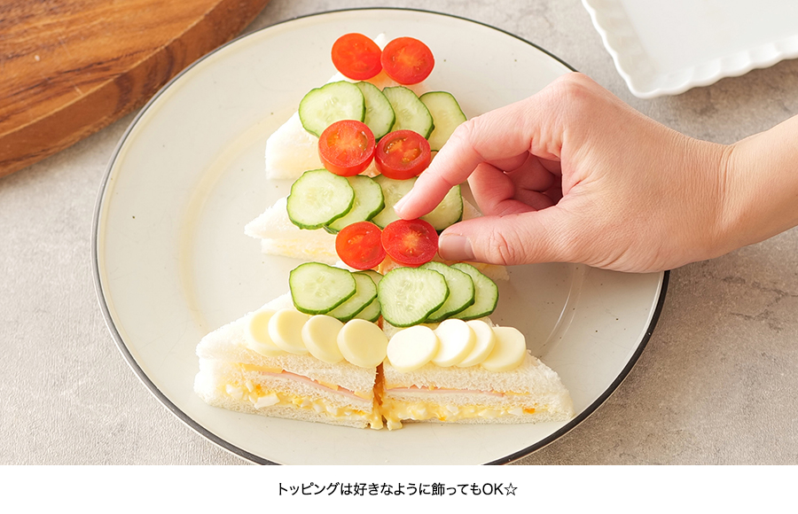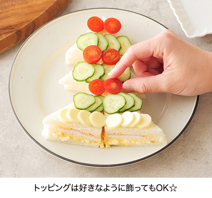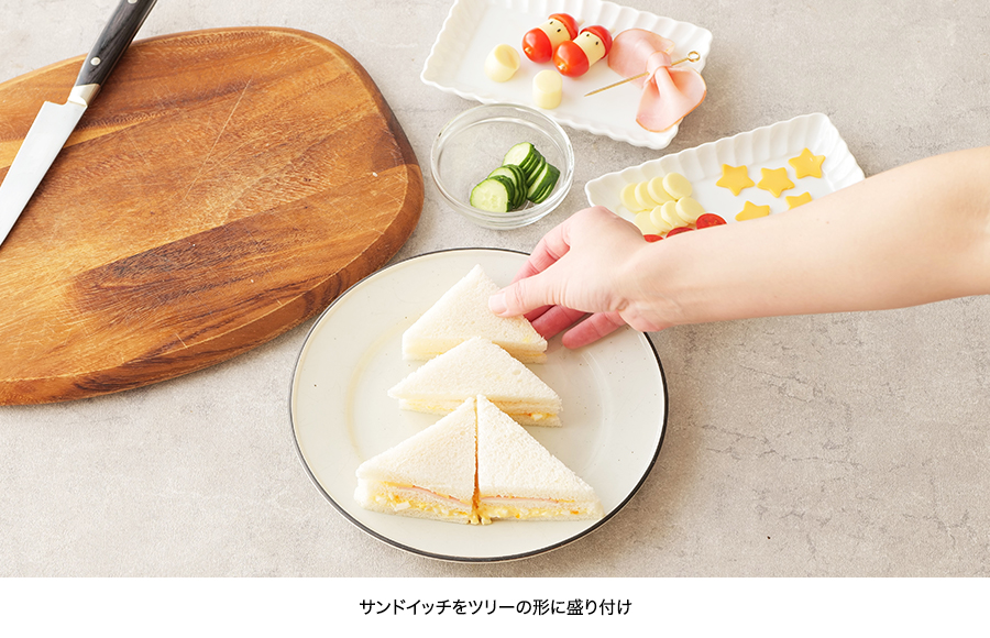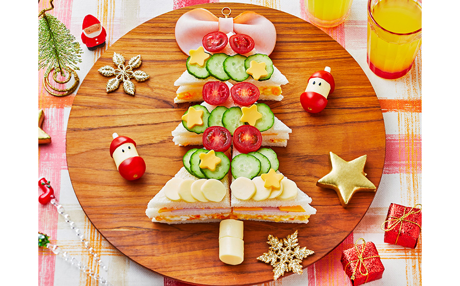 こちらはサンドイッチをツリーの形に並べた、かわいい見た目が特徴のレシピです。飾り用のパーツ作りや盛り付けなど、お子さまが手伝えるポイントがあるので、親子で作るにはぴったりですね!