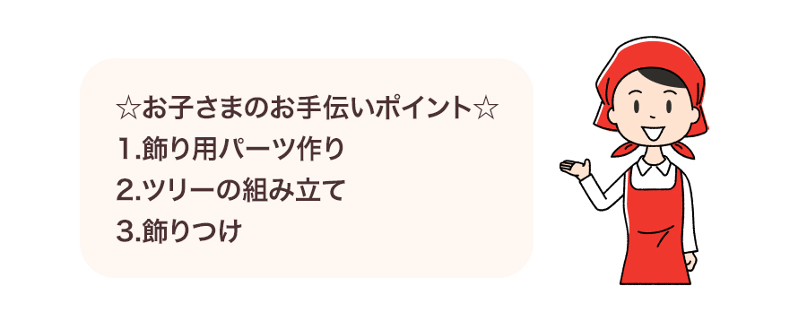 最後に、用意したパーツを使ってツリーを飾り付けます。