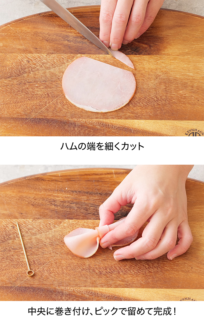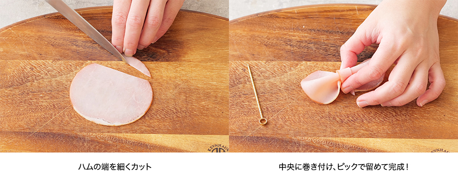 ハムの端を細く切ります。リボン状にしたハムの中央に、細く切ったハムを巻きつけ、ピックで留めて完成です。