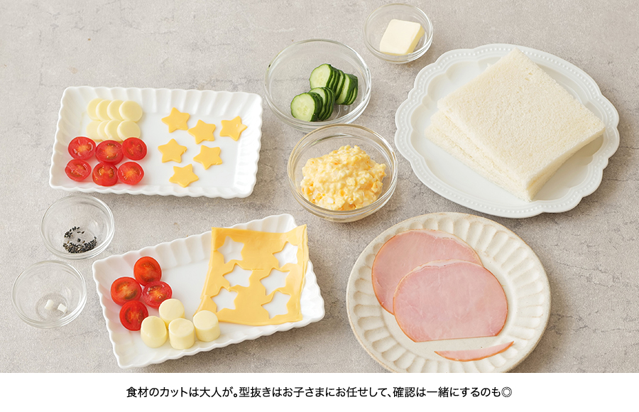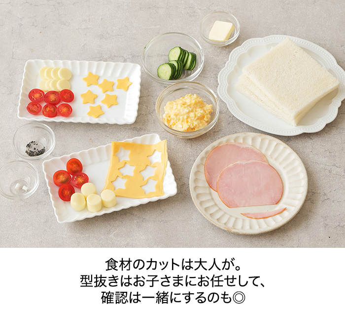 パプリカを星形にくり抜くのはもちろん、パンと具材を重ねて作るサンドイッチ作りもお子さまにチャレンジしてもらいましょう!サンドイッチのカットや、竹串を刺すのは少し危ないので大人が担当。役割を決めて行うのも、親子で作る際におすすめです。