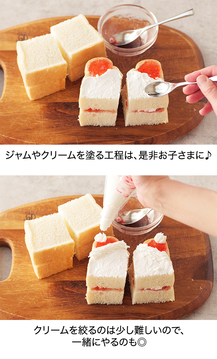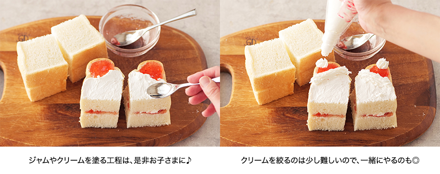 パンをカットするのは大人の方が、クリームを塗るのは少し難しいですが一番のポイントなので、是非お子さまにチャレンジしてもらいましょう!チャレンジした分、完成した時の達成感も抜群です!